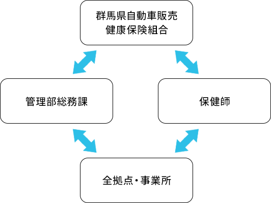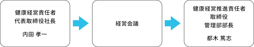 代表取締役社長が責任者として率先して取り組み、取締役管理部部長が実務責任者を務めます。さらに、管理部総務課の健康推進担当者を中心に推進体制を整備し、全社一丸となって従業員の健康づくりを進めてまいります。健康経営推進責任者