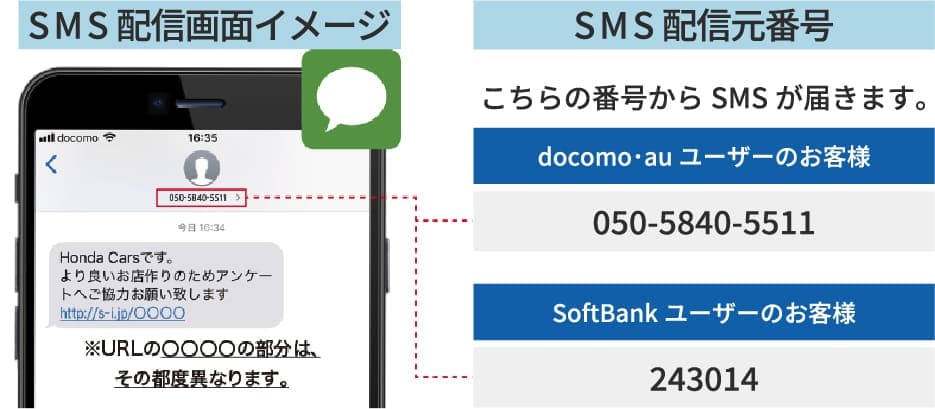 お客様のスマートフォン・携帯電話へ、SMS(ショートメッセージ)にてアンケートを配信させていただく場合がございます。