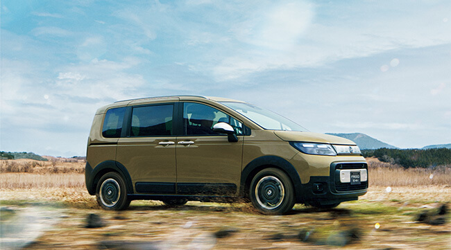 Photo上から:FREED e:HEV AIR EX(FF/6人乗り)ボディーカラーはフィヨルドミスト・パール メーカーオプション(マルチビューカメラシステム、LEDアクティブコーナリングライト、アダプティブドライビングビーム、後退出庫サポート)、ディーラーオプション(11.4インチ Honda CONNECTナビ LXM-247VFLi)装着車、フリード e:HEV CROSSTAR(FF/5人乗り)ボディーカラーはデザートベージュ・パール ディーラーオプション(11.4インチ Honda CONNECTナビ LXM-247VFLi、ボディーサイドモール)装着車、フリード FREED e:HEV AIR EX(FF/6人乗り)ボディーカラーはプラチナホワイト・パール