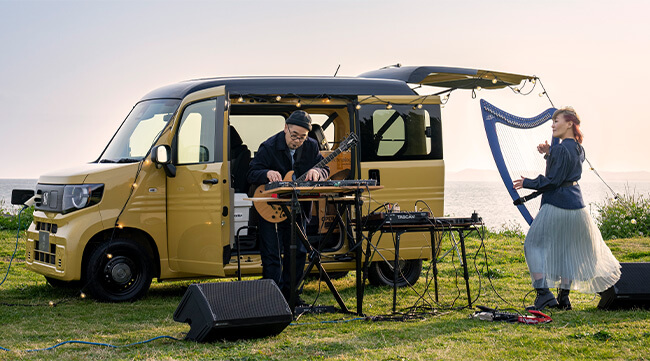 Photo:[上][下]N-VAN e: FUN ボディーカラーはオータムイエロー・パール&ブラック [上]ディーラーオプション(充電ケーブル AC200V/16A ケーブル長 15m 、8インチ Honda CONNECTナビ VXM-245ZFEi)装着車 [下]ディーラーオプション(AC外部給電器(Honda PowerSupply Connector)、ラゲッジマット TPOタイプ、ウインドウプロテクションバー)装着車